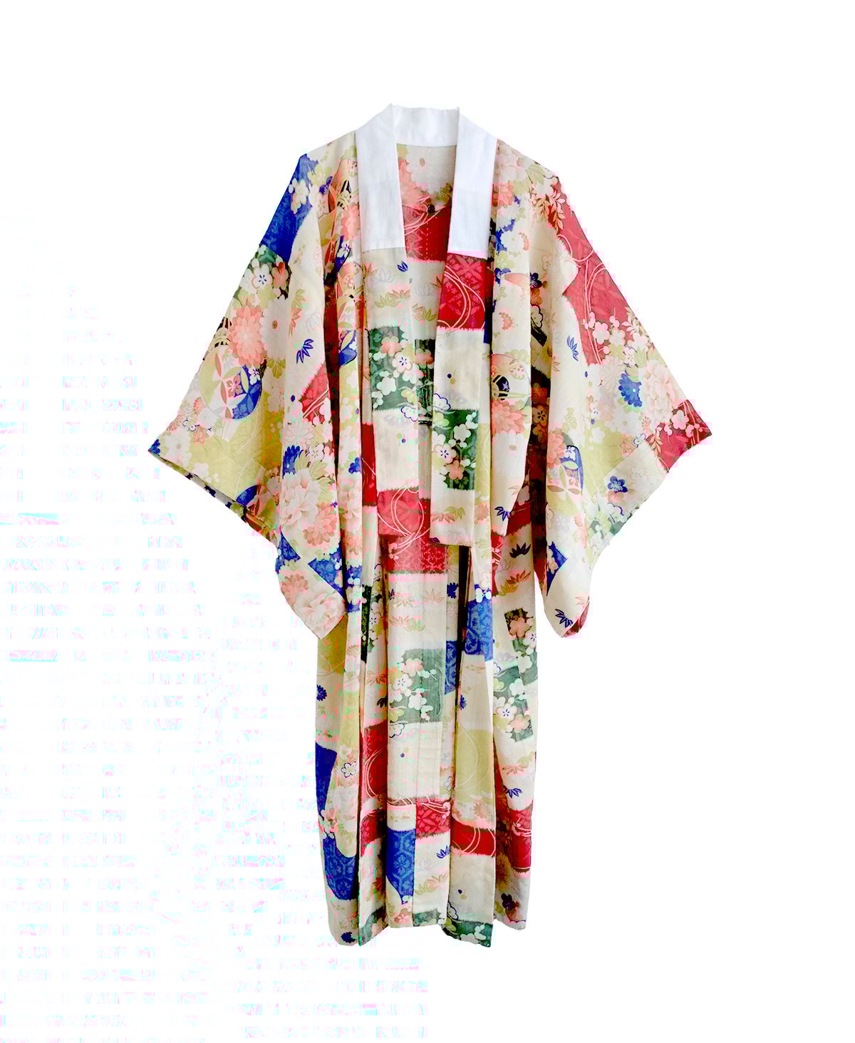 En exceptionel smuk og lun kimono af tynd uld. Motiverne er kirsebærblomster roser mm. Mønstrene er trykt og den er syet o hånden. Kraven er af 100% bomuld. Obs. der er originale japanske reperationer med forstærkning indsyet - se foto.