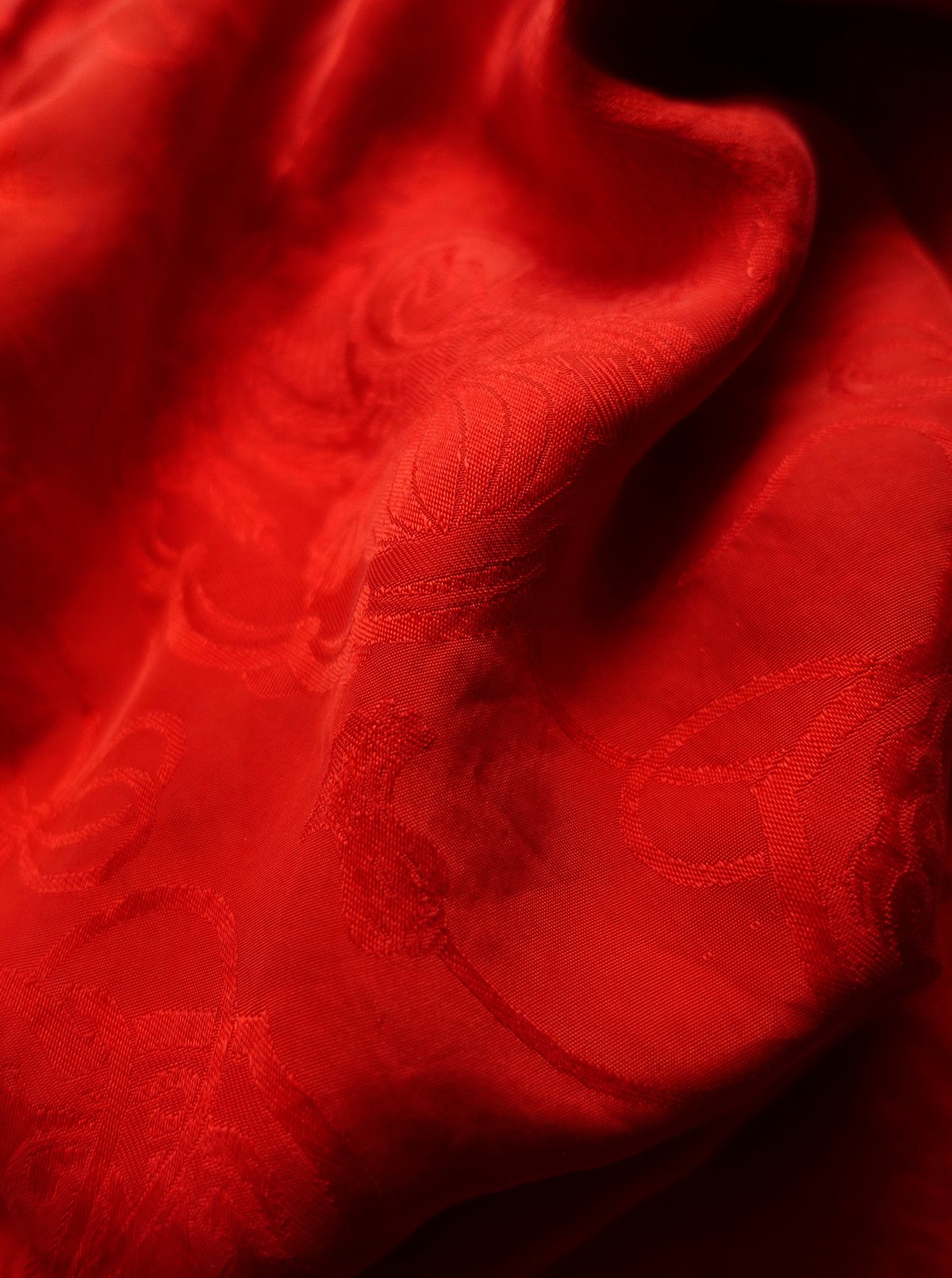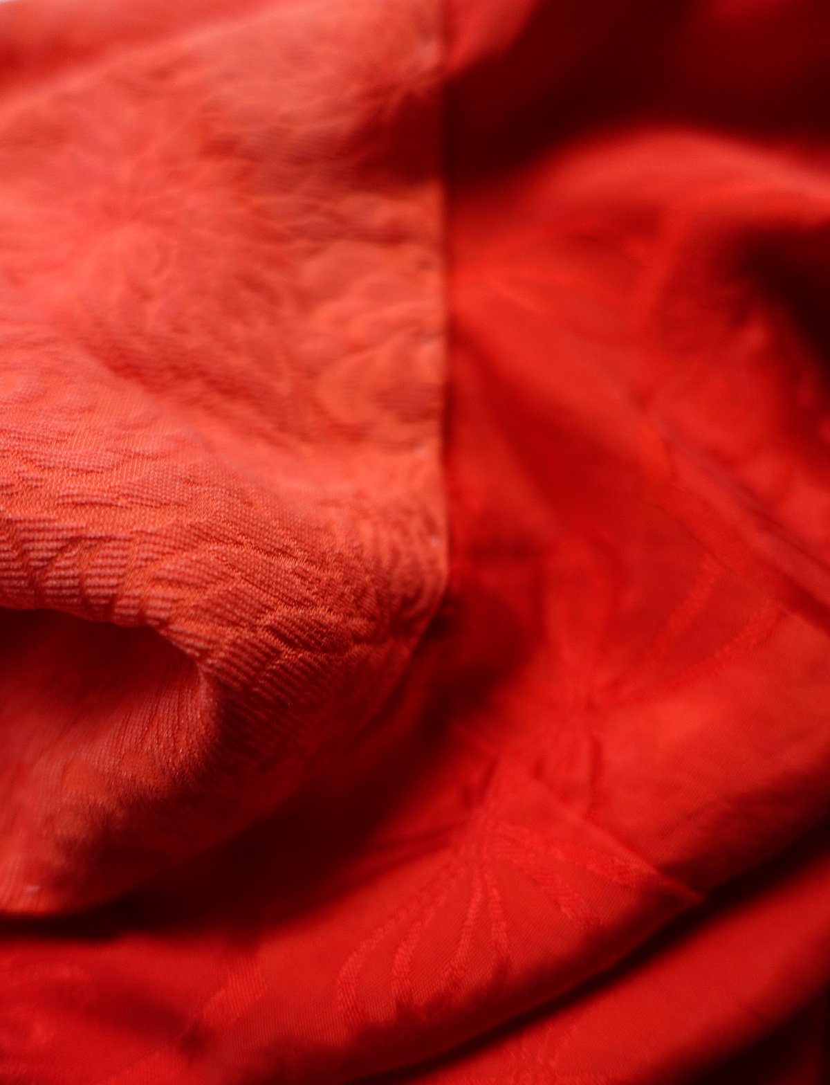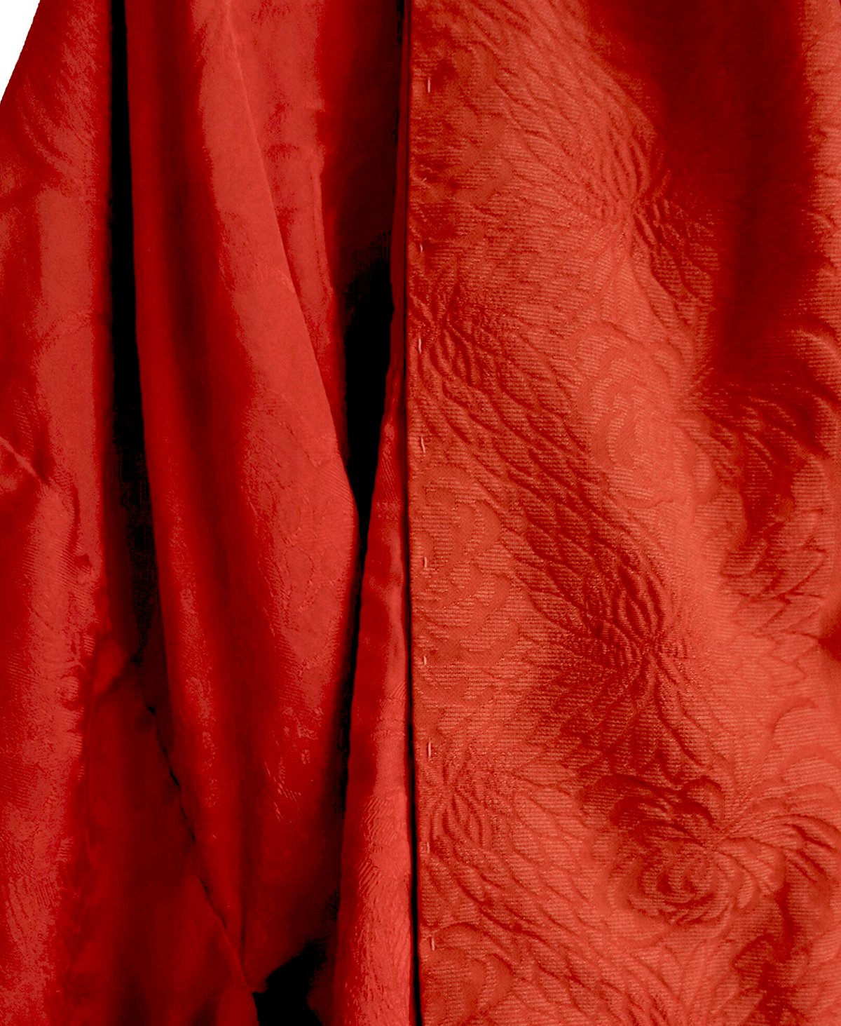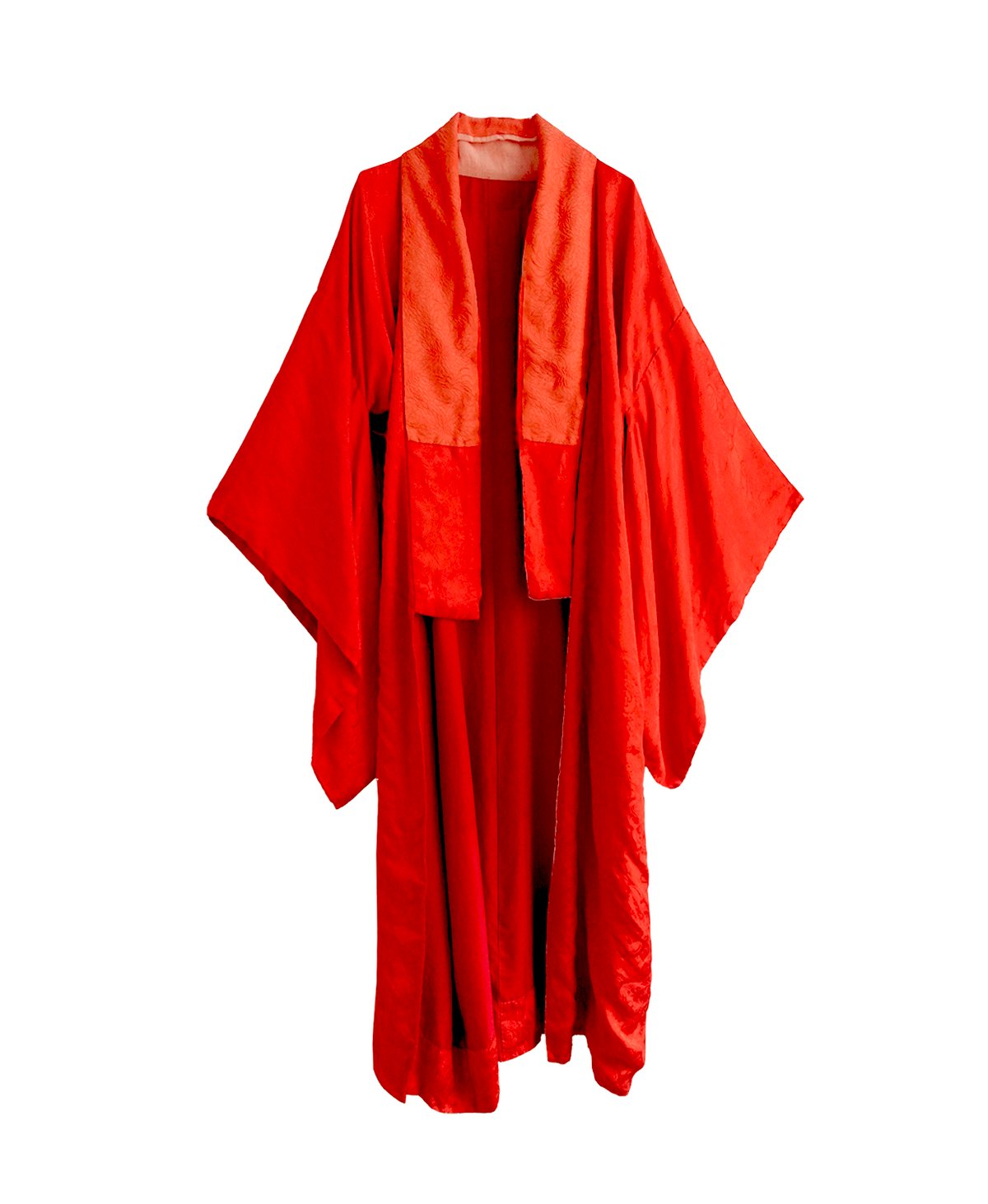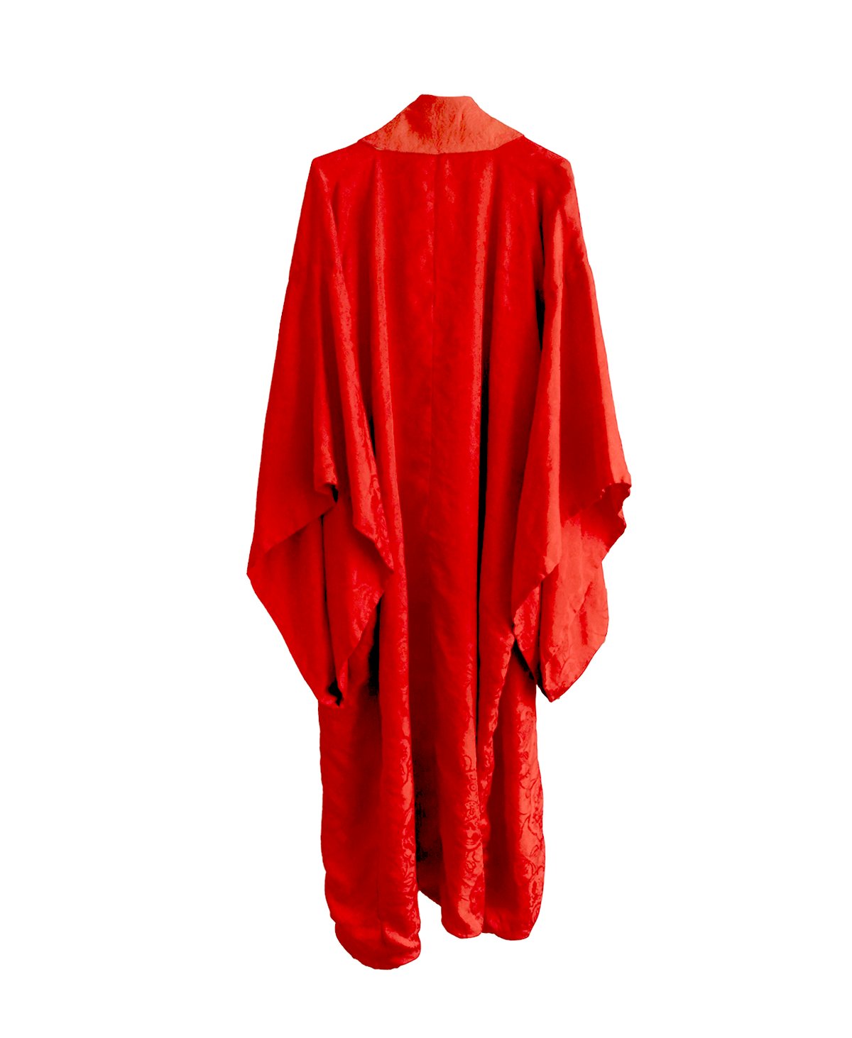 Denne smukke kimono er lavet af en fin højkvalitetssilke, der er usædvanlig blød. I silken er vævet damaskmønstre m. bla. lotusblomster, bånd og fugle. Den røde farve i silken er af en meget smuk høj rød nuance. Kraven kan foldes indad som vist på billedet, eller man kan lade den være helt åben, som man vil.